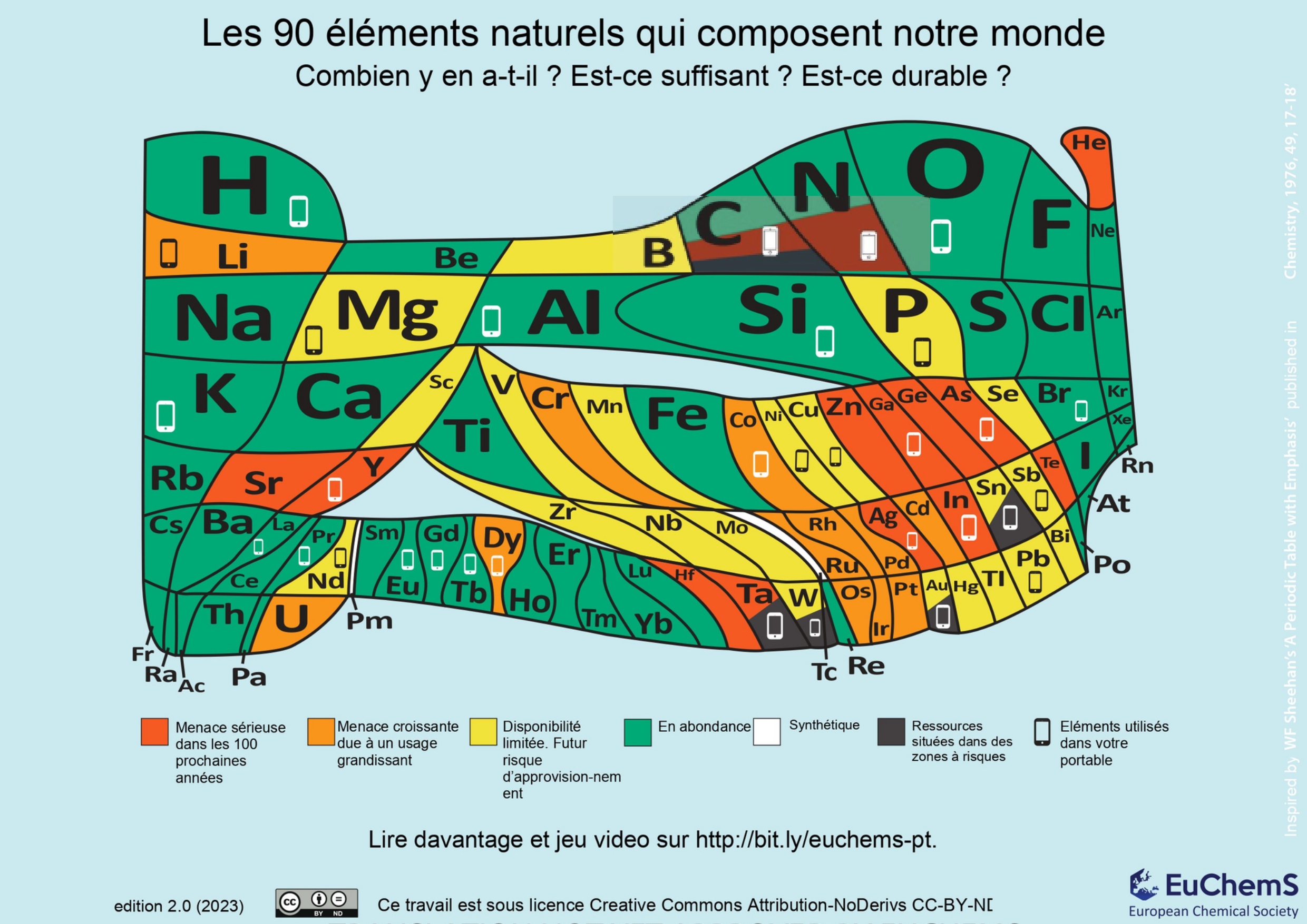 l'European Chemical Society (ECS) publie une version de ce tableau dans lequel la surface de chaque case est liée à l'abondance sur la Terre de l'élément concerné (l'échelle n'est pas linéaire mais logarithmique). Une couleur est attribuée selon le risque de pénurie prévisible :