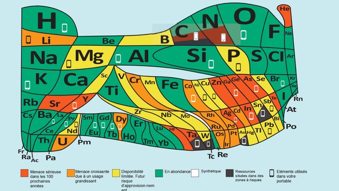 Un tableau périodique dans lequel la surface de chaque case est liée à l'abondance sur la Terre de l'élément concerné. Une couleur est attribuée selon le risque de pénurie prévisible :