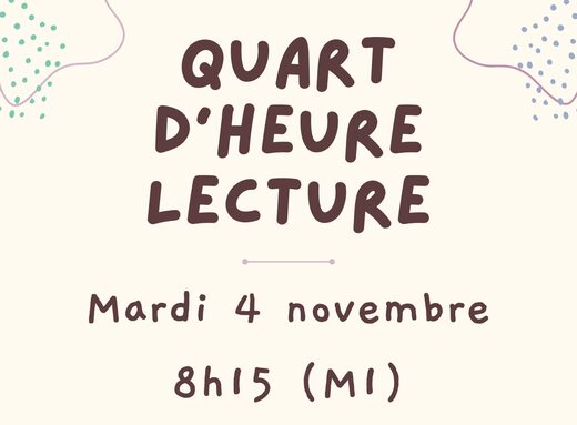 📚 QUART D'HEURE LECTURE ! Mardi 4 novembre à 8h15 (M1) 📚