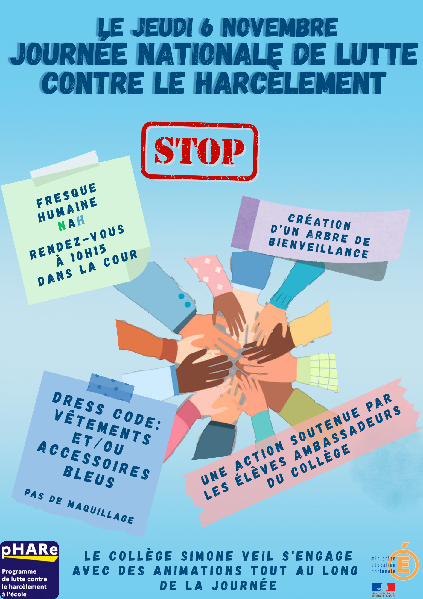 Ce jeudi 06 novembre sera une journée nationale de lutte contre le harcèlement. Plusieurs évènements prévus : réalisation d'une fresque humaine et création d'un arbre de la bienveillance dans le hall.