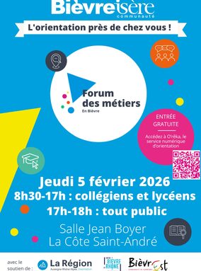 Par Alain Gaume, publié le lundi 19 janvier 2026 11:34 - Mis à jour le lundi 19 janvier 2026 11:34Le forum des métiers à destination des élèves de 5ème aura lieu le jeudi 5 février 2026 de 13h40 à 14h40 à la salle Multisports Jean Boyer – 124-424 avenue Charles de Gaulle – 38260 La Côte Saint-André. -