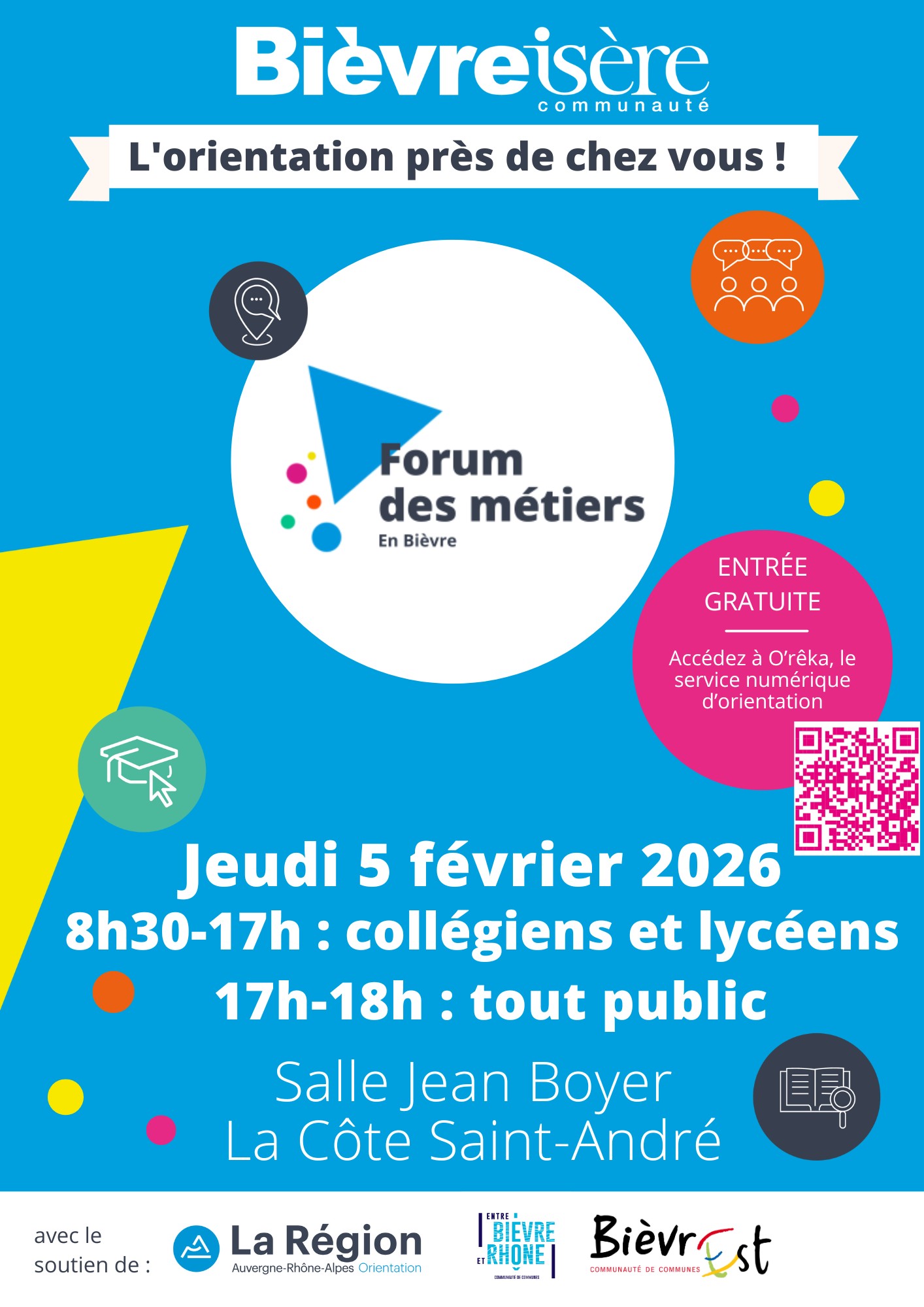 Le forum des métiers à destination des élèves de 5ème aura lieu le jeudi 5 février 2026 de 13h40 à 14h40 à la salle Multisports Jean Boyer – 124-424 avenue Charles de Gaulle – 38260 La Côte Saint-André.
